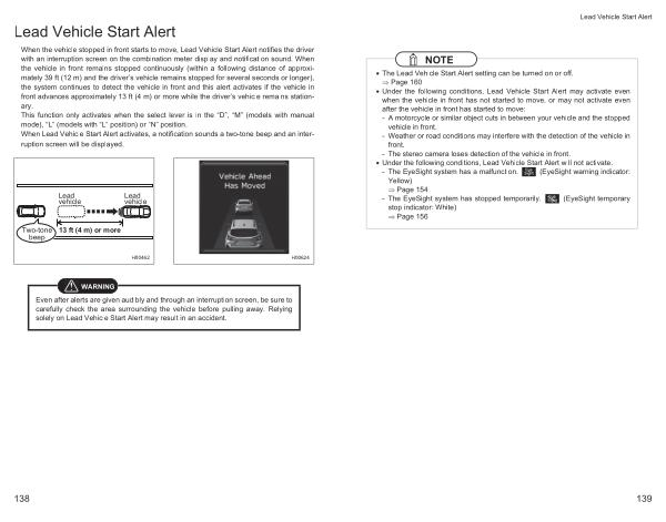 When the vehicle stopped in front starts to move , Lead Vehicle Start Alert notifies the driver with an interruption screen on the combination meter display and notification sound . When the vehicle in front remains stopped continuously ( within a following distance of approximately 39 ft ( 12 m ) and the driver ’ s vehicle remains stopped for several seconds or longer ), the system continues to detect the vehicle in front and this alert activates if the vehicle in front advances approximately 13 ft ( 4 m ) or more while the driver ’ s vehicle remains stationary . This function only activates when the select lever is in the “ D ”, “ M ” ( models with manual mode ), “ L ” ( models with “ L ” position ) or “ N ” position . When Lead Vehicle Start Alert activates , a notification sounds a two-tone beep and an interruption screen will be displayed .