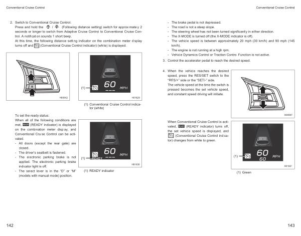 - The brake pedal is not depressed . - The road is not a steep slope . - The steering wheel has not been turned significantly in either direction . - The X-MODE is turned off ( the X-MODE indicator is off ). - The vehicle speed is between approximately 20 mph ( 30 km / h ) and 90 mph ( 145 km / h ). - The engine is not running at a high rpm . - Vehicle Dynamics Control or Traction Control Function is not active .