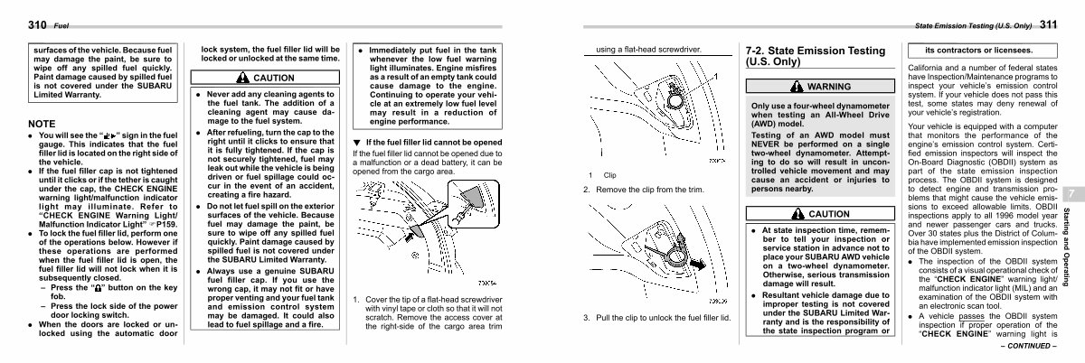 surfaces of the vehicle. Because fuel may damage the paint, be sure to wipe off any spilled fuel quickly. Paint damage caused by spilled fuel is not covered under the SUBARU Limited Warranty.