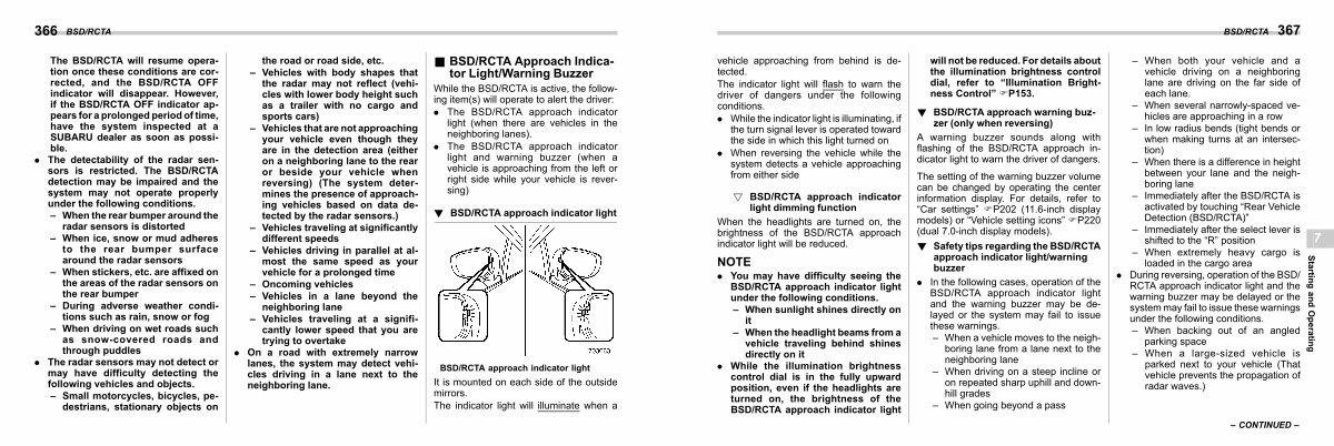 The BSD / RCTA will resume operation once these conditions are corrected, and the BSD / RCTA OFF indicator will disappear. However, if the BSD / RCTA OFF indicator appears for a prolonged period of time, have the system inspected at a SUBARU dealer as soon as possible.