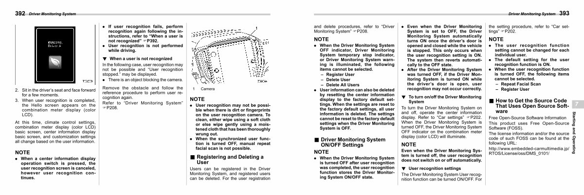 . Even when the Driver Monitoring System is set to OFF, the Driver Monitoring System automatically turns ON once the driver’ s door is opened and closed while the vehicle is stopped. This only occurs when the user recognition setting is ON. The system then reverts automatically to the OFF state.