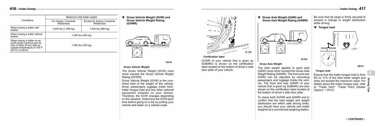 Maximum total trailer weight Except for Subaru Crosstrek Wilderness