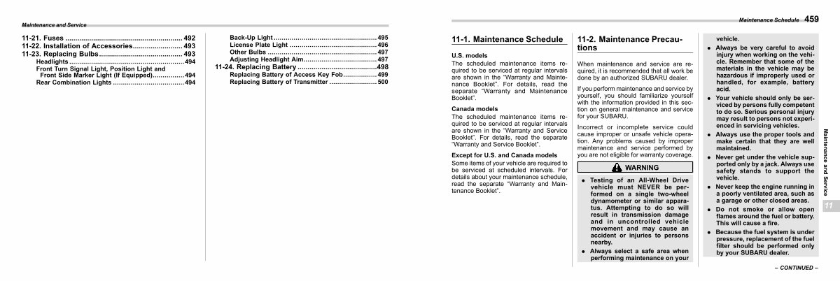 11-21. Fuses........................................................... 492 11-22. Installation of Accessories......................... 493 11-23. Replacing Bulbs.......................................... 493 Headlights.......................................................... 494 Front Turn Signal Light, Position Light and Front Side Marker Light( If Equipped)................ 494