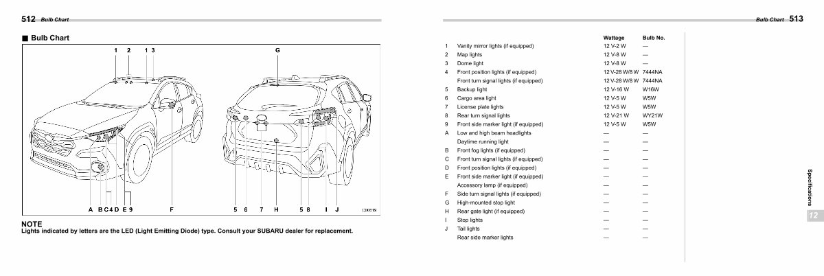 Lights indicated by letters are the LED( Light Emitting Diode) type. Consult your SUBARU dealer for replacement.