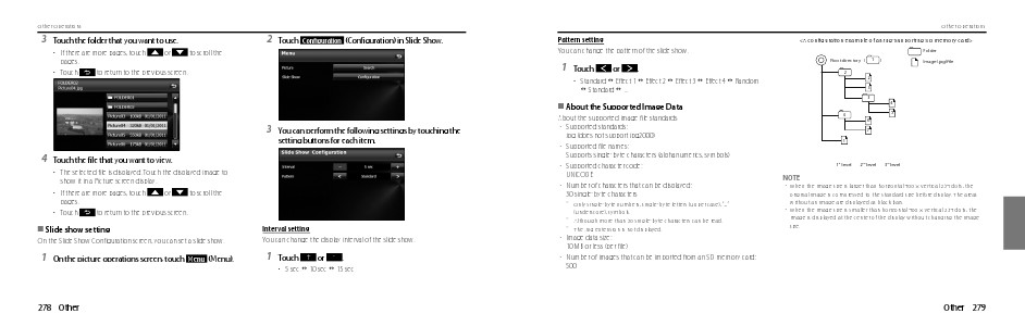 Folder 1 Root directory ( Touch or • Standard Effect 1 Standard ... . 2 Effect 2 Effect 3 Effect 4 Random 3 I About the Supported Image Data * Only single-byte numbers, single-byte letters (upper case), “_” (underscore), symbols. * Although more than 30 single-byte characters can be read. * The .jpg extension is not displayed. Image (.jpg) file 2 3 About the supported image file standards • Supported standards: jpg (does not support jpg2000) • Supported file names: Supports
