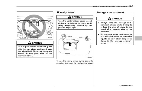 Interior equipment/Storage compartment & Vanity mirror CAUTION Keep the vanity mirror cover closed while the car is being driven to avoid being temporarily blinded by the glare of bright light. CAUTION 6-5 Storage compartment CAUTION . Always keep the storage compartment closed while driving to reduce the risk of injury in the event of a sudden stop or an accident. . Do not store spray cans, containers with flammable or corrosive liquids or any other dangerous items in the storage compartment. Do not pull out the extension plate with the sun visor positioned over the windshield. The extension plate would obstruct your view of the rearview mirror. To use the vanity mirror, swing down the sun visor and open the vanity mirror cover. – CONTINUED –