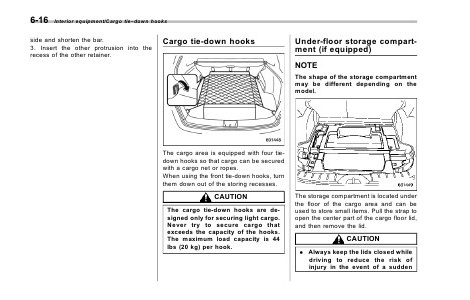 6-16 Interior equipment/Cargo tie–down hooks side and shorten the bar. 3. Insert the other protrusion into the recess of the other retainer. Cargo tie-down hooks Under-floor storage compartment (if equipped) NOTE The shape of the storage compartment may be different depending on the model. The cargo area is equipped with four tiedown hooks so that cargo can be secured with a cargo net or ropes. When using the front tie-down hooks, turn them down out of the storing recesses. CAUTION The cargo tie-down hooks are designed only for securing light cargo. Never try to secure cargo that exceeds the capacity of the hooks. The maximum load capacity is 44 lbs (20 kg) per hook. The storage compartment is located under the floor of the cargo area and can be used to store small items. Pull the strap to open the center part of the cargo floor lid, and then remove the lid. CAUTION . Always keep the lids closed while driving to reduce the risk of injury in the event of a sudden