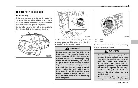 Starting and operating/Fuel 7-5 & Fuel filler lid and cap ! Refueling Only one person should be involved in refueling. Do not allow others to approach the area of the vehicle near the fuel filler pipe while refueling is in progress. Be sure to observe any other precautions that are posted at the service station. 1. To open the fuel filler lid, pull the lid release lever up. The lever is on the floor at the left of the driver’s seat. WARNING Before opening the fuel filler cap, first touch the vehicle body or a metal portion of the fuel pump or similar object to discharge any static electricity that may be present on your body. If your body is carrying an electrostatic charge, there is a possibility that an electric spark could ignite the fuel, which could burn you. To avoid acquiring a new static electric charge, do not get back into the vehicle while refueling is in progress. 1) 2) Open Close 2. Remove the fuel filler cap by turning it slowly counterclockwise. WARNING . Gasoline vapor is highly flammable. Before refueling, always first stop the engine and close all vehicle doors and windows. Make sure that there are no lighted cigarettes, open flames or electrical sparks in the adjacent area. Only handle fuel outdoors. Quickly wipe up any spilled fuel. . When opening the cap, grasp it firmly and turn it slowly to the – CONTINUED –
