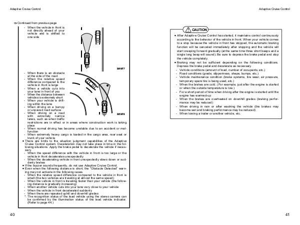 � After Adaptive Cruise Control has started, it maintains control continuously according to the behavior of the vehicle in front. When your vehicle comes to a stop because the vehicle in front has stopped, the automatic braking function will be canceled immediately after stopping and the vehicle will start creeping forward gradually( at the same time three short beeps and a single long beep will sound). Be sure to depress the brake pedal and stop the vehicle completely.