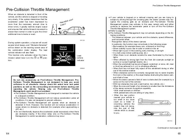� If your vehicle is trapped on a railroad crossing and you are trying to escape by driving through the crossing gate, the stereo camera may recognize the crossing gate as an obstacle and Pre-Collision Throttle Management system may activate. In this case, remain calm and either continue to depress the accelerator pedal or turn off the Pre-Collision Throttle Management system.