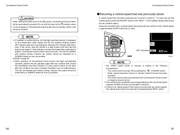 vehicle speed, press the RES/SET switch to the “RES/+”. (The EyeSight display area shows