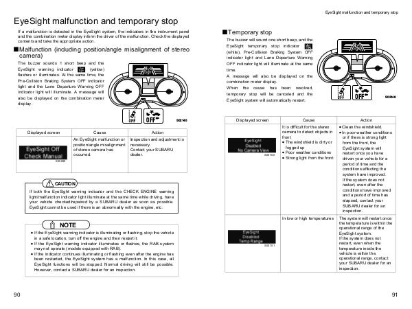 The buzzer will sound one short beep, and the EyeSight temporary stop indicator( white), Pre-Collision Braking System OFF indicator light and Lane Departure Warning OFF indicator light will illuminate at the same time. A message will also be displayed on the combination meter display. When the cause has been resolved, temporary stop will be canceled and the EyeSight system will automatically restart.