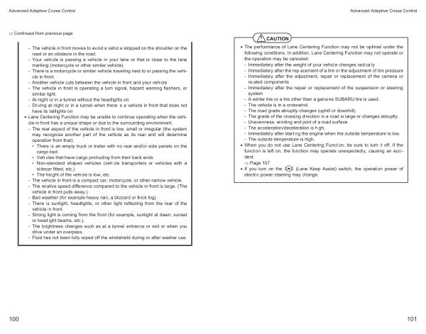 • The performance of Lane Centering Function may not be optimal under the following conditions . In addition , Lane Centering Function may not operate or the operation may be canceled . - Immediately after the weight of your vehicle changes radically - Immediately after the replacement of a tire or the adjustment of tire pressure - Immediately after the adjustment , repair or replacement of the camera or related components - Immediately after the repair or replacement of the suspension or steering system - A winter tire or a tire other than a genuine SUBARU tire is used . - The vehicle is in a crosswind . - The road grade abruptly changes ( uphill or downhill ). - The grade of the crossing direction in a road is large or changes abruptly . - Unevenness , winding and joint of a road surface - The acceleration / deceleration is high . - Immediately after starting the engine when the outside temperature is low . - The outside temperature is high .