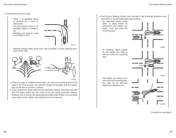 • Pre-Collision Braking System may activate in the following situations even when there is no identified object approaching . - An identified object slows down or stops before an intersection just before you make a turn and enter the oncoming lane .