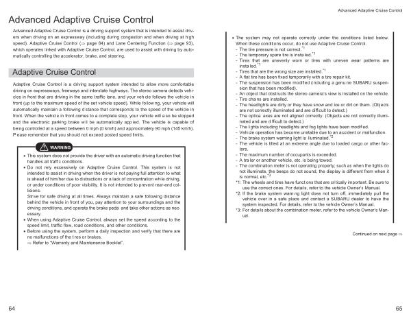 • The system may not operate correctly under the conditions listed below . When these conditions occur , do not use Adaptive Cruise Control . - The tire pressure is not correct . * 1 - The temporary spare tire is installed . * 1 - Tires that are unevenly worn or tires with uneven wear patterns are installed . * 1 - Tires that are the wrong size are installed . * 1 - A flat tire has been fixed temporarily with a tire repair kit . - The suspension has been modified ( including a genuine SUBARU suspension that has been modified ). - An object that obstructs the stereo camera ’ s view is installed on the vehicle . - Tire chains are installed . - The headlights are dirty or they have snow and ice or dirt on them . ( Objects are not correctly illuminated and are difficult to detect .) - The optical axes are not aligned correctly . ( Objects are not correctly illuminated and are difficult to detect .) - The lights including headlights and fog lights have been modified . - Vehicle operation has become unstable due to an accident or malfunction . - The brake system warning light is illuminated . * 2 - The vehicle is tilted at an extreme angle due to loaded cargo or other factors . - The maximum number of occupants is exceeded . - A trailer or another vehicle , etc . is being towed . - The combination meter is not operating properly ; such as when the lights do not illuminate , the beeps do not sound , the display is different from when it is normal , etc . * 3