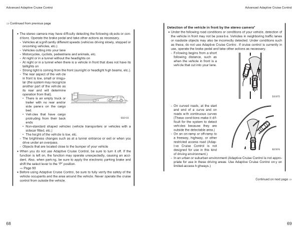 • The stereo camera may have difficulty detecting the following objects or conditions . Operate the brake pedal and take other actions as necessary . - Vehicles at significantly different speeds ( vehicles driving slowly , stopped or oncoming vehicles , etc .) - Vehicles cutting into your lane - Motorcycles , cyclists , pedestrians and animals , etc . - At night or in a tunnel without the headlights on - At night or in a tunnel when there is a vehicle in front that does not have its taillights on - Strong light is coming from the front ( sunlight or headlight high beams , etc .). - The rear aspect of the vehicle in front is low , small or irregular ( the system may recognize another part of the vehicle as its rear and will determine operation from that ).