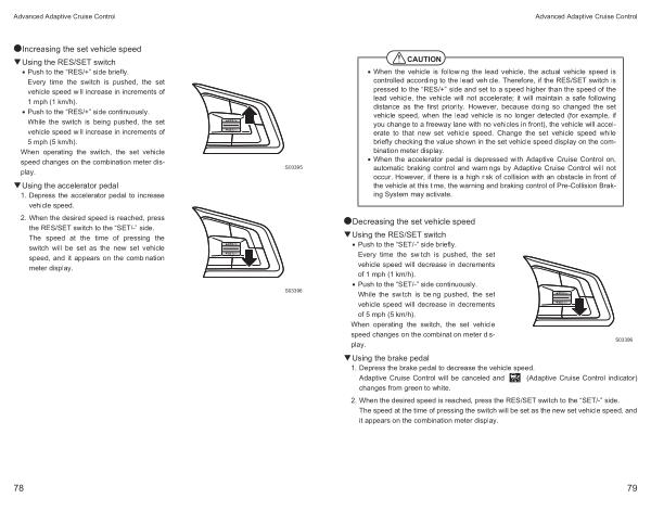 • When the vehicle is following the lead vehicle , the actual vehicle speed is controlled according to the lead vehicle . Therefore , if the RES / SET switch is pressed to the “ RES /+” side and set to a speed higher than the speed of the lead vehicle , the vehicle will not accelerate ; it will maintain a safe following distance as the first priority . However , because doing so changed the set vehicle speed , when the lead vehicle is no longer detected ( for example , if you change to a freeway lane with no vehicles in front ), the vehicle will accelerate to that new set vehicle speed . Change the set vehicle speed while briefly checking the value shown in the set vehicle speed display on the combination meter display .