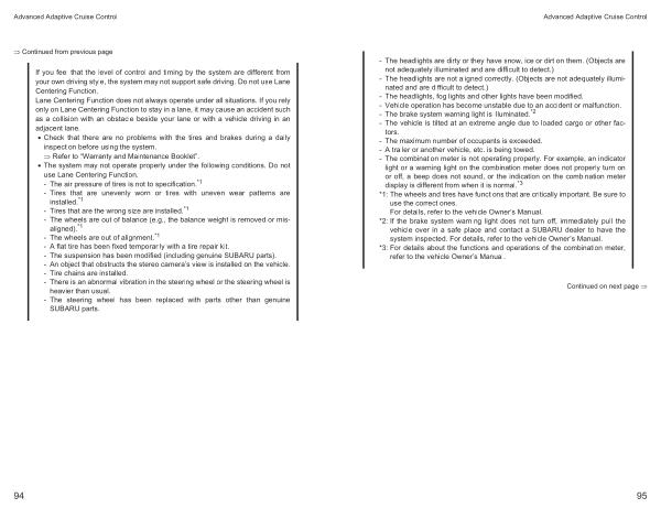 • The system may not operate properly under the following conditions . Do not use Lane Centering Function . - The air pressure of tires is not to specification . * 1 - Tires that are unevenly worn or tires with uneven wear patterns are installed . * 1 - Tires that are the wrong size are installed . * 1 - The wheels are out of balance ( e . g ., the balance weight is removed or misaligned ). * 1 - The wheels are out of alignment . * 1 - A flat tire has been fixed temporarily with a tire repair kit . - The suspension has been modified ( including genuine SUBARU parts ). - An object that obstructs the stereo camera ’ s view is installed on the vehicle . - Tire chains are installed . - There is an abnormal vibration in the steering wheel or the steering wheel is heavier than usual . - The steering wheel has been replaced with parts other than genuine