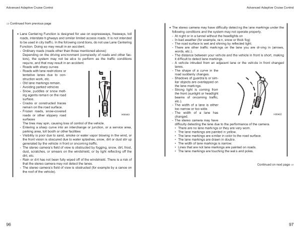 • The stereo camera may have difficulty detecting the lane markings under the following conditions and the system may not operate properly . - At night or in a tunnel without the headlights on - In bad weather ( for example , rain , snow or thick fog ) - The road surface is wet and shining by reflected light . - There are other traffic markings on the lane you are driving in ( arrows , words , etc .). - The distance between your vehicle and the vehicle in front is short , making it difficult to detect lane markings . - A vehicle intruded from an adjacent lane or the vehicle in front changed lanes . - The shape of a curve in the road suddenly changes .