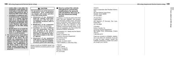 Changing or moving any parts of the front seats , rear seat , seatbelts , front bumper , front side frame , radiator panel , instrument panel , combination meter , steering wheel , steering column , tire , suspension or floor panel can affect the operation of the SUBARU advanced airbag system . If you have any questions , you may contact the following SUBARU distributors .