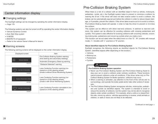 About identified objects for Pre-Collision Braking System EyeSight recognizes the following objects as identified objects for Pre-Collision Braking System . ( Identified objects differ depending on the function .)