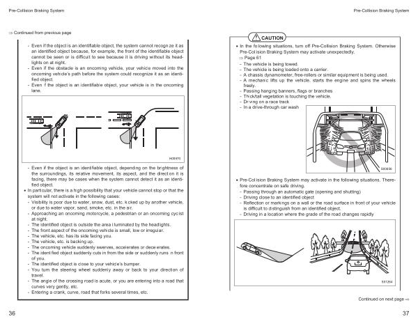 • In particular , there is a high possibility that your vehicle cannot stop or that the system will not activate in the following cases : - Visibility is poor due to water , snow , dust , etc . kicked up by another vehicle , or due to water vapor , sand , smoke , etc . in the air . - Approaching an oncoming motorcycle , a pedestrian or an oncoming cyclist at night . - The identified object is outside the area illuminated by the headlights . - The front aspect of the oncoming vehicle is small , low or irregular . - The vehicle , etc . has its side facing you . - The vehicle , etc . is backing up . - The oncoming vehicle suddenly swerves , accelerates or decelerates . - The identified object suddenly cuts in from the side or suddenly runs in front of you . - The identified object is close to your vehicle ’ s bumper . - You turn the steering wheel suddenly away or back to your direction of travel . - The angle of the crossing road is acute , or you are entering into a road that curves very gently , etc . - Entering a crank , curve , road that forks several times , etc .