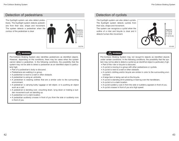 The EyeSight system can also detect cyclists . The EyeSight system detects cyclists from their size , shape and movement . The system can recognize a cyclist when the outline of a rider and bicycle is clear and it detects human-like movement .