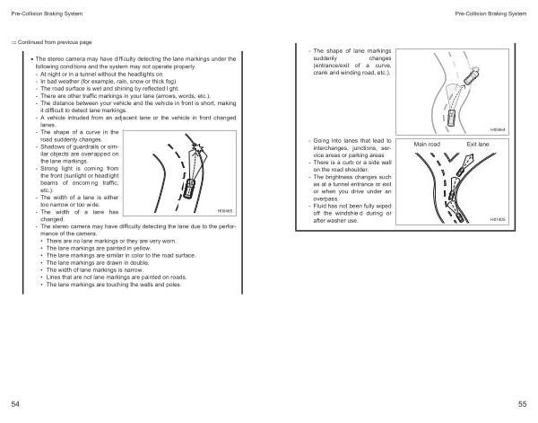 • The stereo camera may have difficulty detecting the lane markings under the following conditions and the system may not operate properly . - At night or in a tunnel without the headlights on - In bad weather ( for example , rain , snow or thick fog ) - The road surface is wet and shining by reflected light . - There are other traffic markings in your lane ( arrows , words , etc .). - The distance between your vehicle and the vehicle in front is short , making it difficult to detect lane markings . - A vehicle intruded from an adjacent lane or the vehicle in front changed lanes . - The shape of a curve in the road suddenly changes .