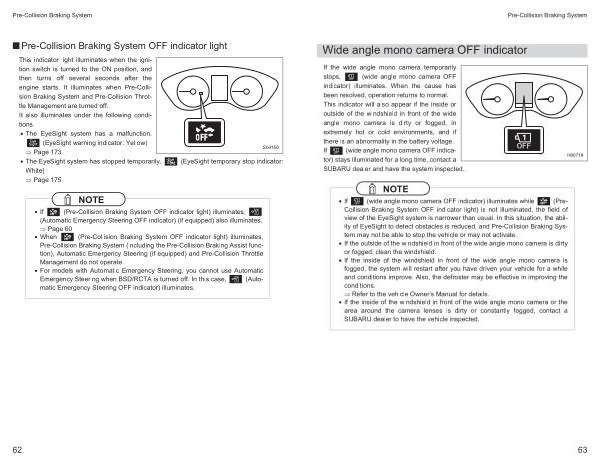 • If ( wide angle mono camera OFF indicator ) illuminates while ( Pre- Collision Braking System OFF indicator light ) is not illuminated , the field of view of the EyeSight system is narrower than usual . In this situation , the ability of EyeSight to detect obstacles is reduced , and Pre-Collision Braking System may not be able to stop the vehicle or may not activate .