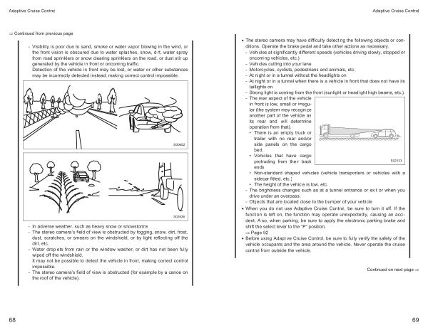 • The stereo camera may have difficulty detecting the following objects or conditions . Operate the brake pedal and take other actions as necessary . - Vehicles at significantly different speeds ( vehicles driving slowly , stopped or oncoming vehicles , etc .) - Vehicles cutting into your lane - Motorcycles , cyclists , pedestrians and animals , etc . - At night or in a tunnel without the headlights on - At night or in a tunnel when there is a vehicle in front that does not have its taillights on - Strong light is coming from the front ( sunlight or headlight high beams , etc .). - The rear aspect of the vehicle in front is low , small or irregular ( the system may recognize another part of the vehicle as its rear and will determine operation from that ).
