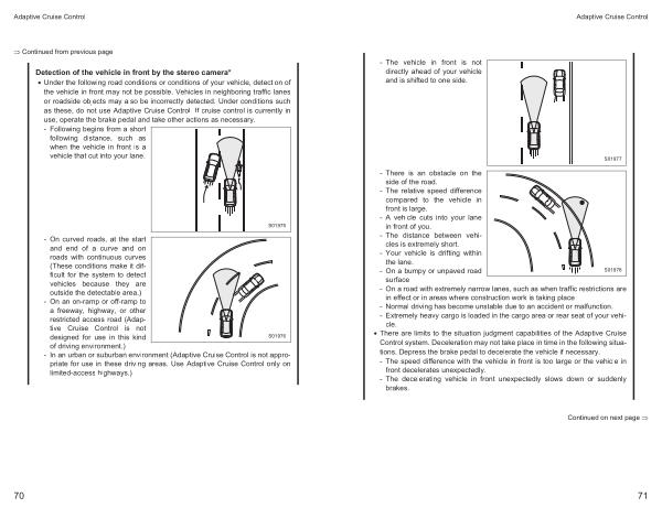 • Under the following road conditions or conditions of your vehicle , detection of the vehicle in front may not be possible . Vehicles in neighboring traffic lanes or roadside objects may also be incorrectly detected . Under conditions such as these , do not use Adaptive Cruise Control . If cruise control is currently in use , operate the brake pedal and take other actions as necessary . - Following begins from a short following distance , such as when the vehicle in front is a vehicle that cut into your lane .