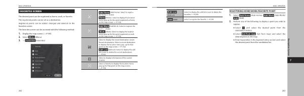 The desired point can be registered as home , work , or favorite . The registered points can be set as a destination . Registered points can be added , changed and deleted on the favorites screen . The favorites screen can be accessed with the following method :