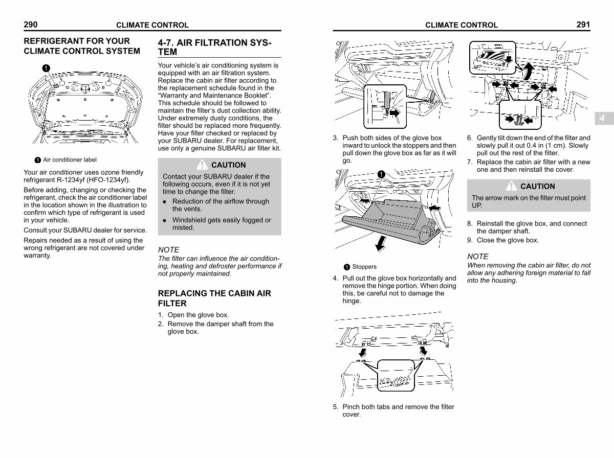 Your vehicle’ s air conditioning system is equipped with an air filtration system. Replace the cabin air filter according to the replacement schedule found in the“ Warranty and Maintenance Booklet”. This schedule should be followed to maintain the filter’ s dust collection ability. Under extremely dusty conditions, the filter should be replaced more frequently. Have your filter checked or replaced by your SUBARU dealer. For replacement, use only a genuine SUBARU air filter kit.