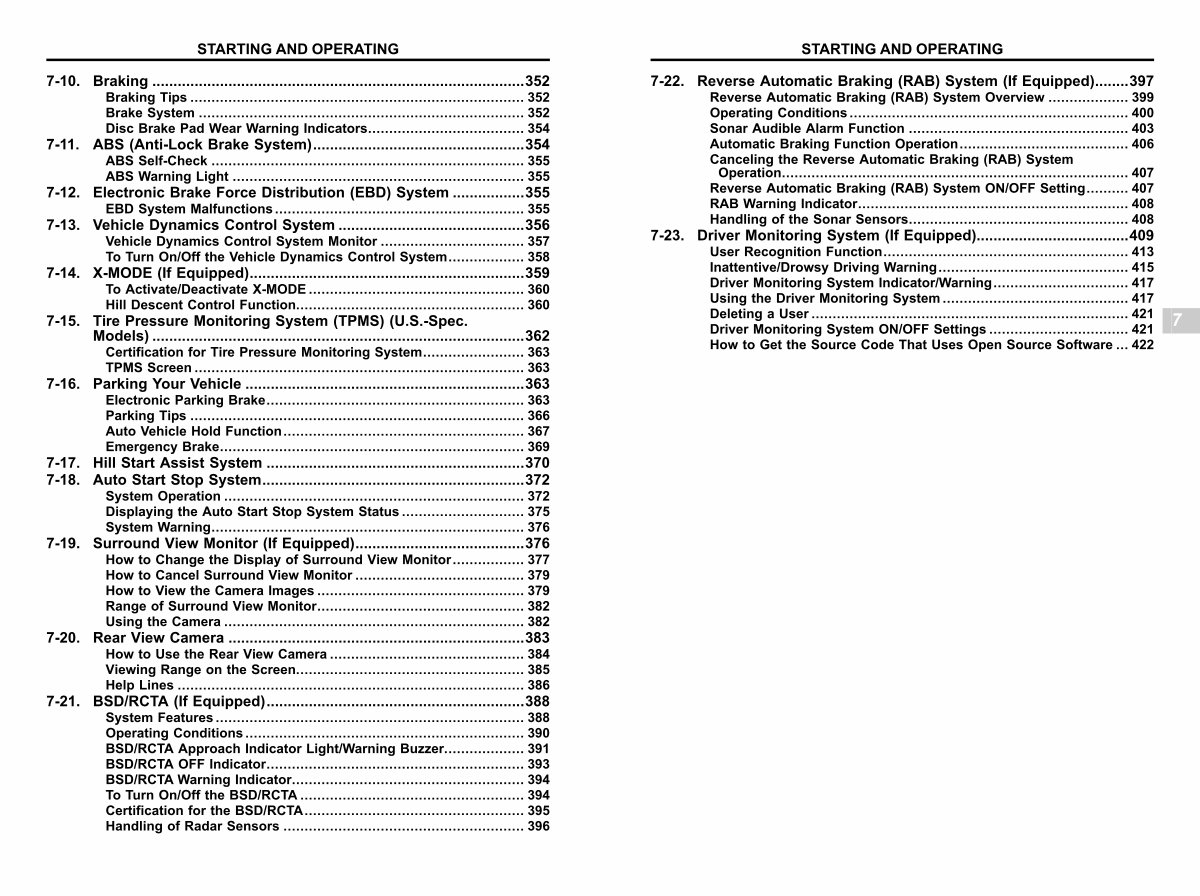 7-22. Reverse Automatic Braking( RAB) System( If Equipped)........ 397 Reverse Automatic Braking( RAB) System Overview................... 399 Operating Conditions.................................................................. 400 Sonar Audible Alarm Function.................................................... 403 Automatic Braking Function Operation........................................ 406 Canceling the Reverse Automatic Braking( RAB) System Operation.................................................................................. 407