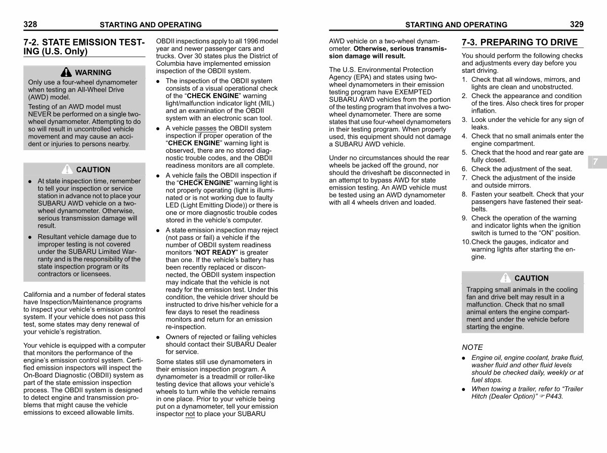 The U. S. Environmental Protection Agency( EPA) and states using twowheel dynamometers in their emission testing program have EXEMPTED SUBARU AWD vehicles from the portion of the testing program that involves a twowheel dynamometer. There are some states that use four-wheel dynamometers in their testing program. When properly used, this equipment should not damage a SUBARU AWD vehicle.