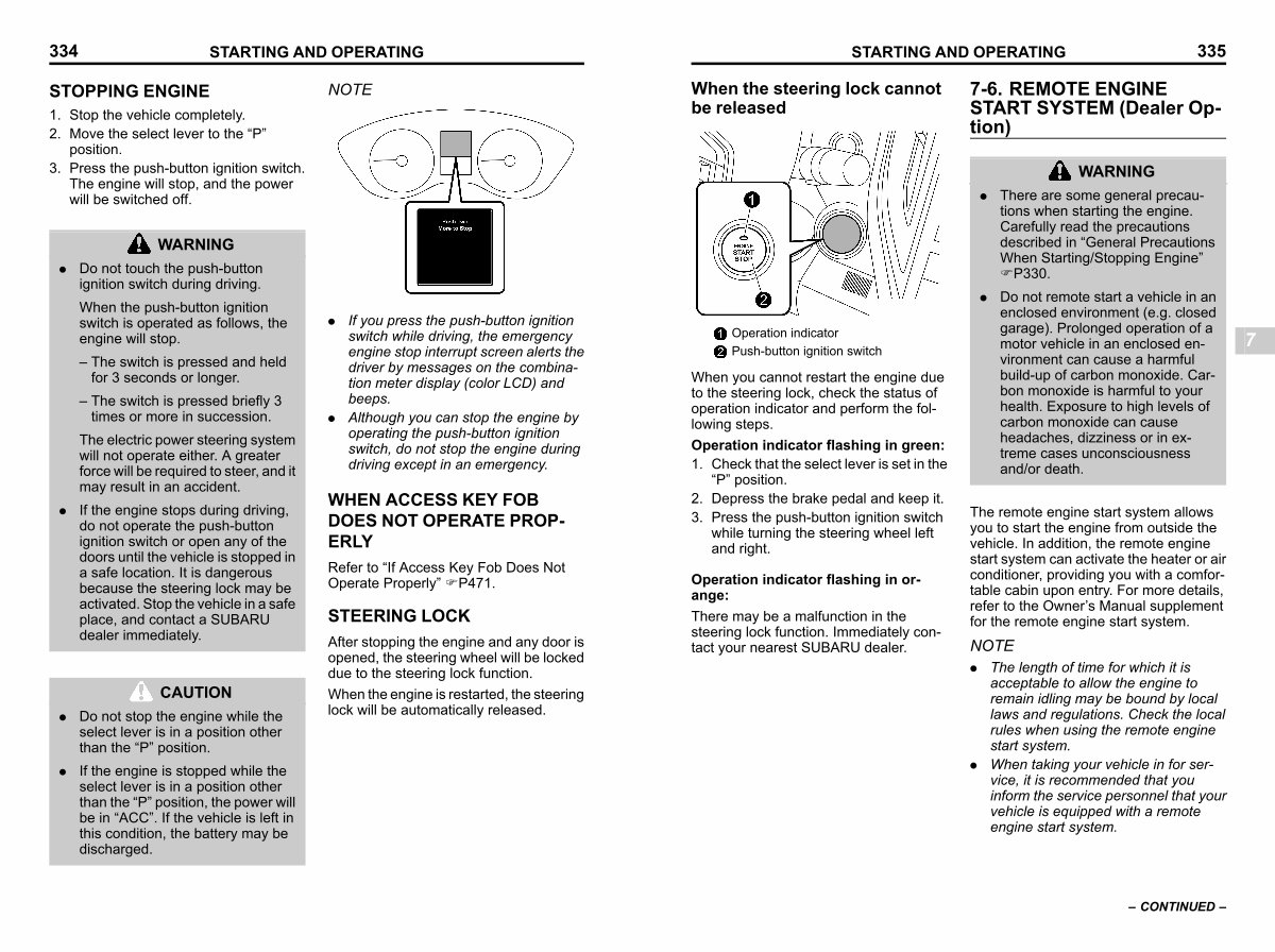 . If the engine stops during driving, do not operate the push-button ignition switch or open any of the doors until the vehicle is stopped in a safe location. It is dangerous because the steering lock may be activated. Stop the vehicle in a safe place, and contact a SUBARU dealer immediately.