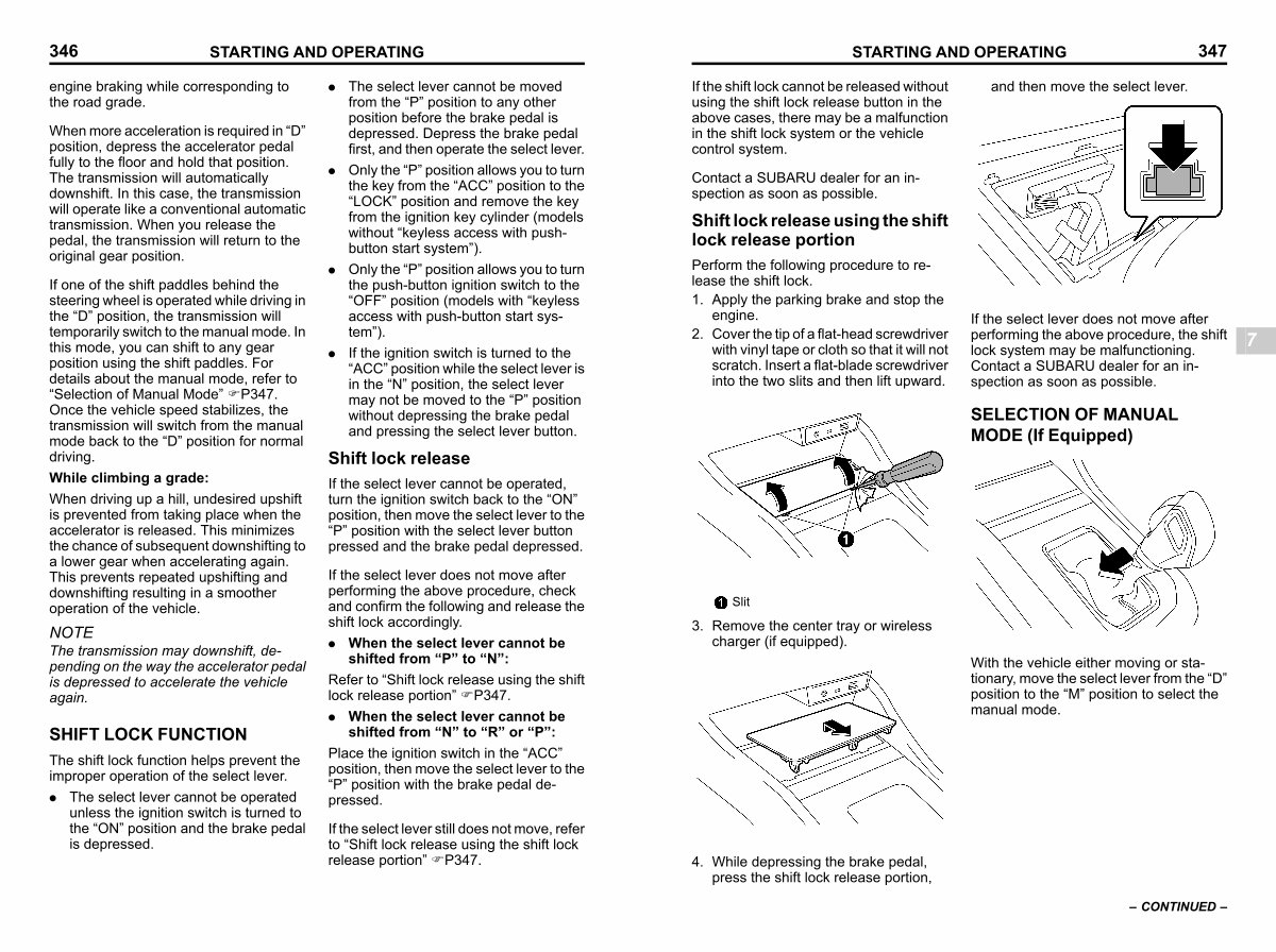 If the select lever does not move after performing the above procedure, the shift lock system may be malfunctioning. Contact a SUBARU dealer for an inspection as soon as possible.