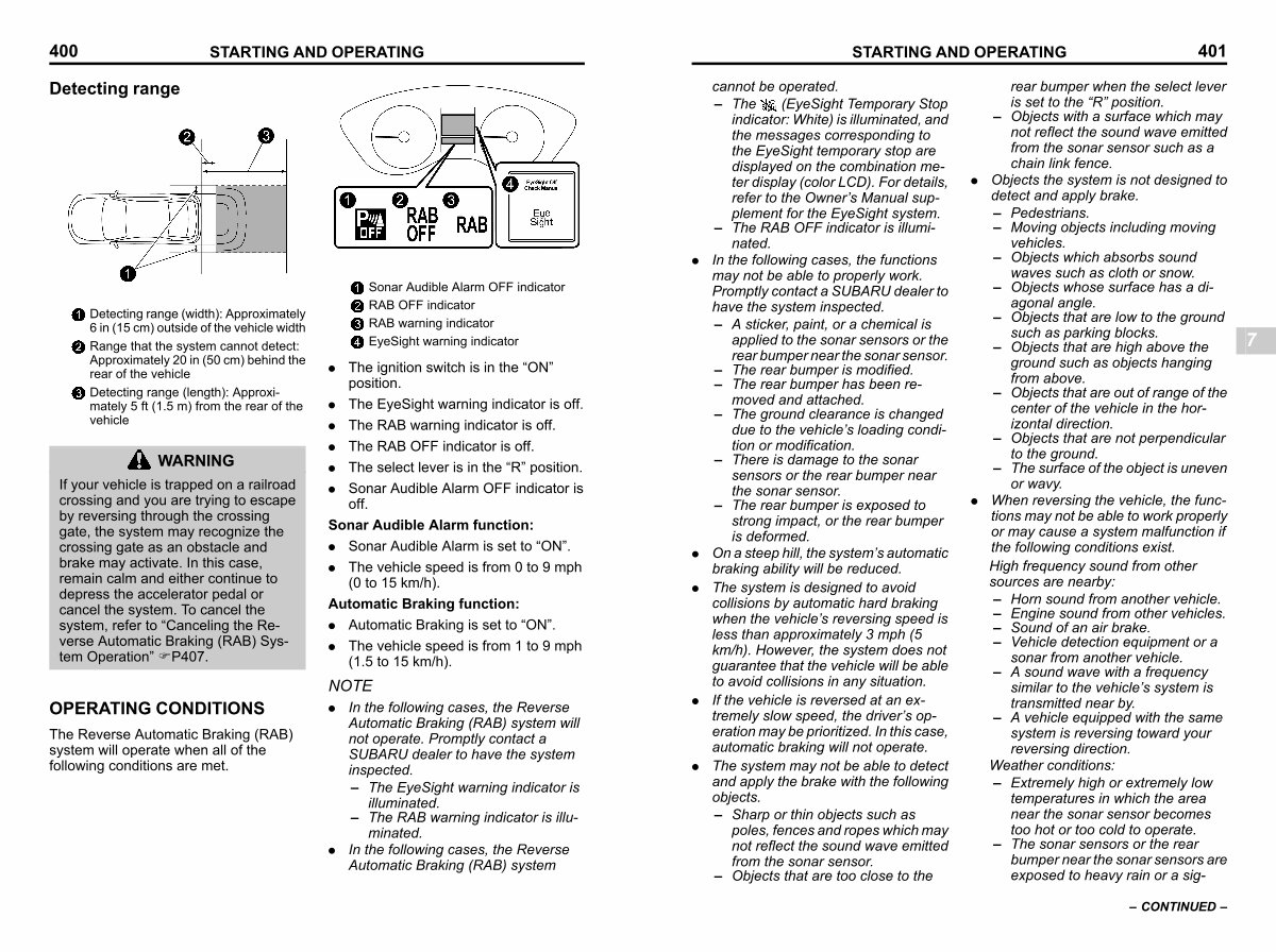 . In the following cases, the Reverse Automatic Braking( RAB) system will not operate. Promptly contact a SUBARU dealer to have the system inspected.