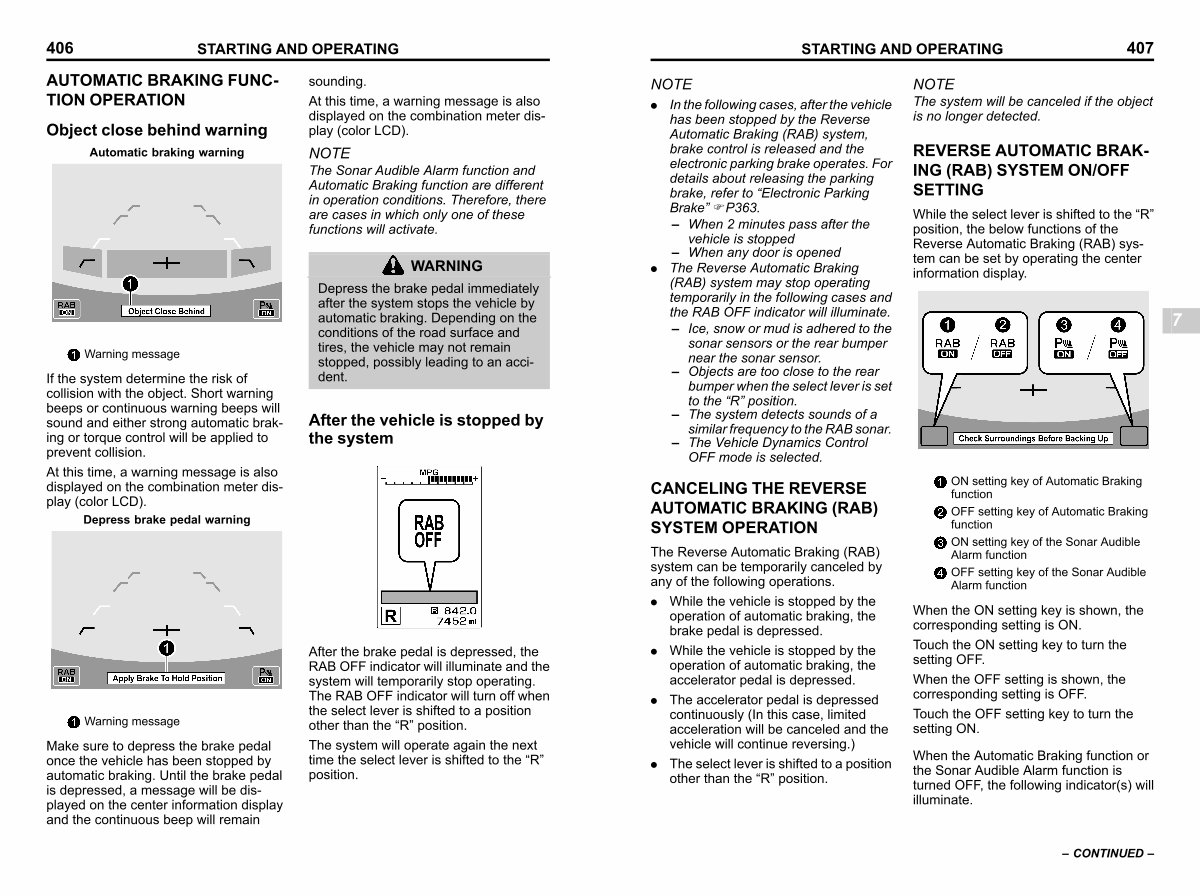 Make sure to depress the brake pedal once the vehicle has been stopped by automatic braking. Until the brake pedal is depressed, a message will be displayed on the center information display and the continuous beep will remain