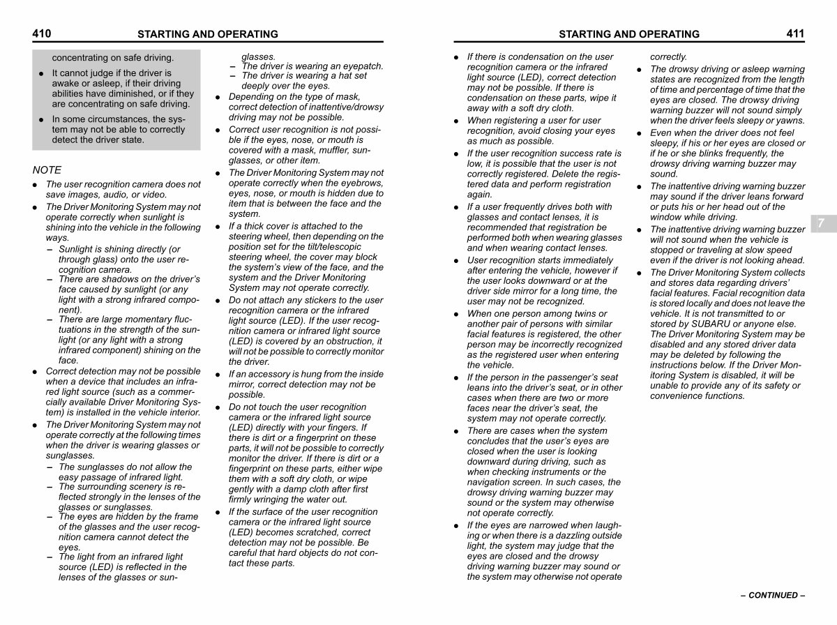 . The Driver Monitoring System collects and stores data regarding drivers’ facial features. Facial recognition data is stored locally and does not leave the vehicle. It is not transmitted to or stored by SUBARU or anyone else. The Driver Monitoring System may be disabled and any stored driver data may be deleted by following the instructions below. If the Driver Monitoring System is disabled, it will be unable to provide any of its safety or convenience functions.