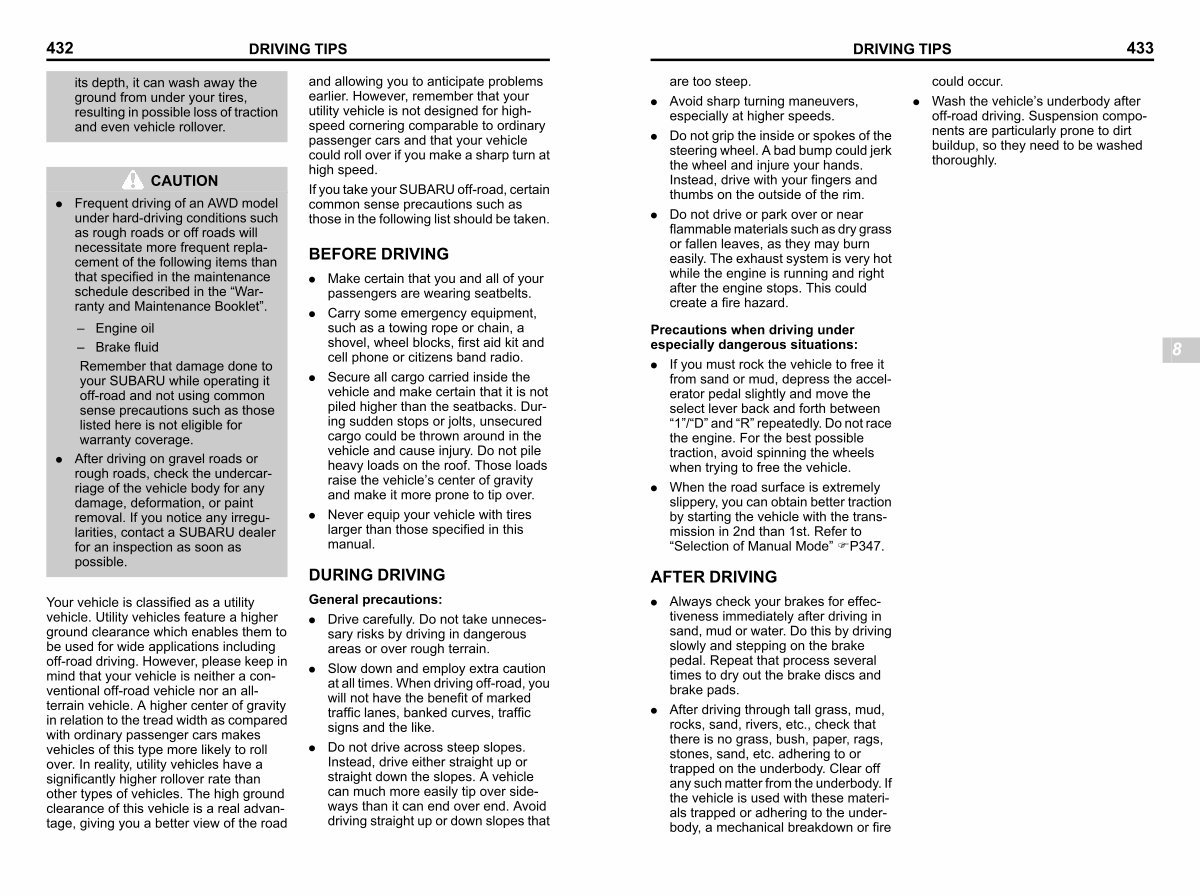 If you take your SUBARU off-road, certain common sense precautions such as those in the following list should be taken.