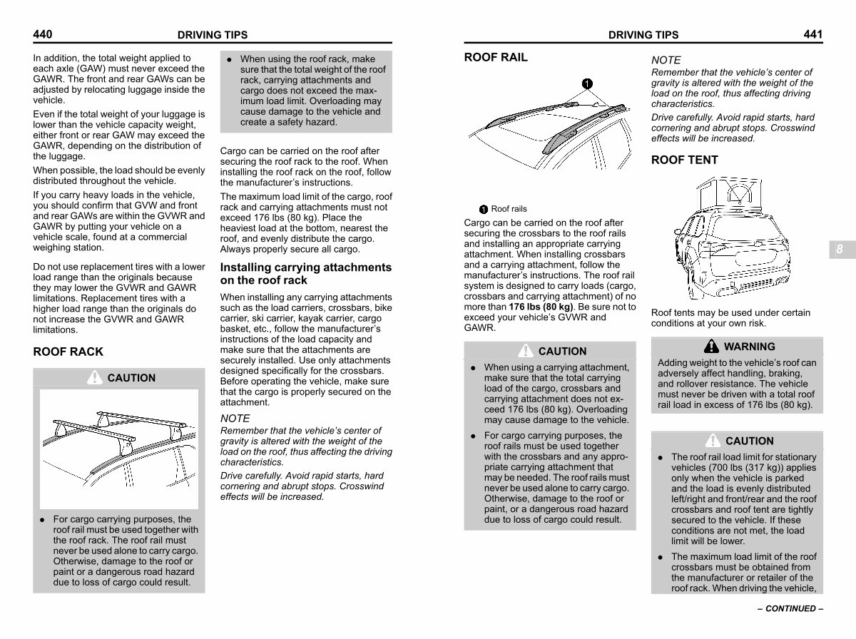 The maximum load limit of the cargo, roof rack and carrying attachments must not exceed 176 lbs( 80 kg). Place the heaviest load at the bottom, nearest the roof, and evenly distribute the cargo. Always properly secure all cargo.