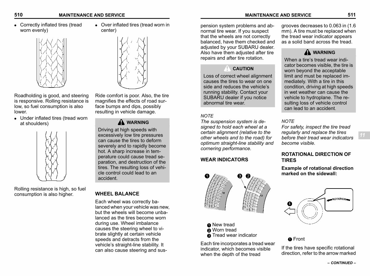 pension system problems and abnormal tire wear. If you suspect that the wheels are not correctly balanced, have them checked and adjusted by your SUBARU dealer. Also have them adjusted after tire repairs and after tire rotation.