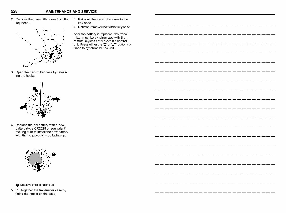 After the battery is replaced, the transmitter must be synchronized with the remote keyless entry system’ s control unit. Press either the“” or“” button six times to synchronize the unit.