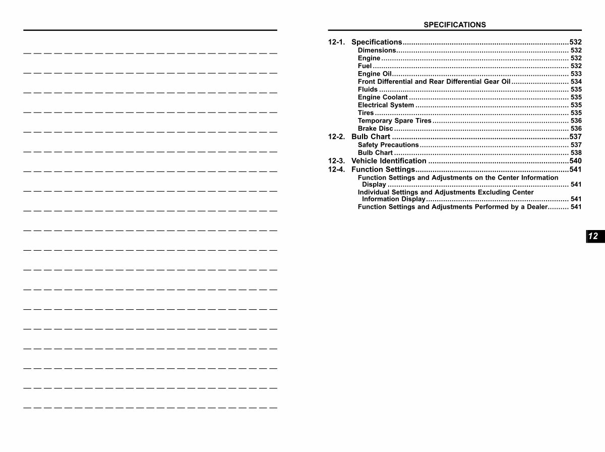 12-2. Bulb Chart................................................................................... 537 Safety Precautions...................................................................... 537 Bulb Chart.................................................................................. 538 12-3. Vehicle Identification.................................................................. 540 12-4. Function Settings........................................................................ 541 Function Settings and Adjustments on the Center Information Display..................................................................................... 541