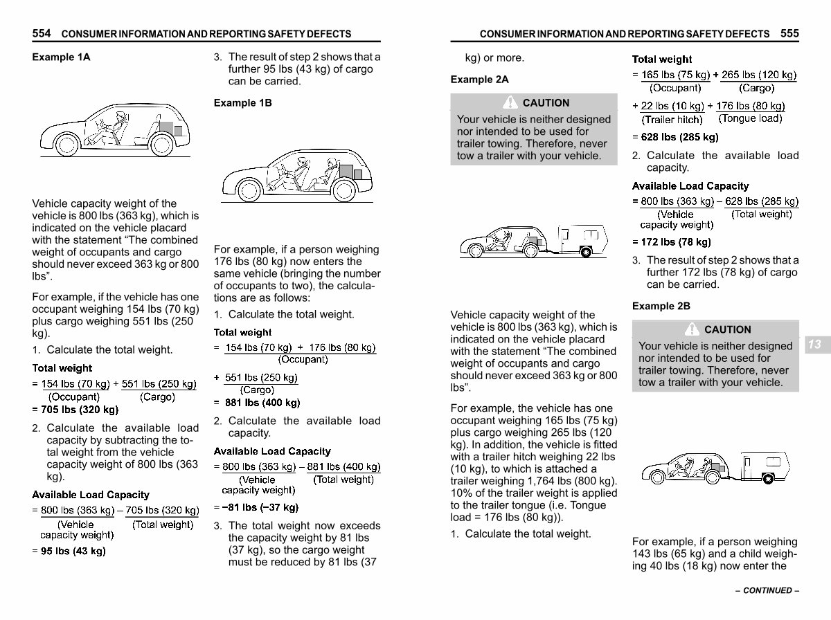 For example, the vehicle has one occupant weighing 165 lbs( 75 kg) plus cargo weighing 265 lbs( 120 kg). In addition, the vehicle is fitted with a trailer hitch weighing 22 lbs( 10 kg), to which is attached a trailer weighing 1,764 lbs( 800 kg). 10 % of the trailer weight is applied to the trailer tongue( i. e. Tongue load = 176 lbs( 80 kg)).