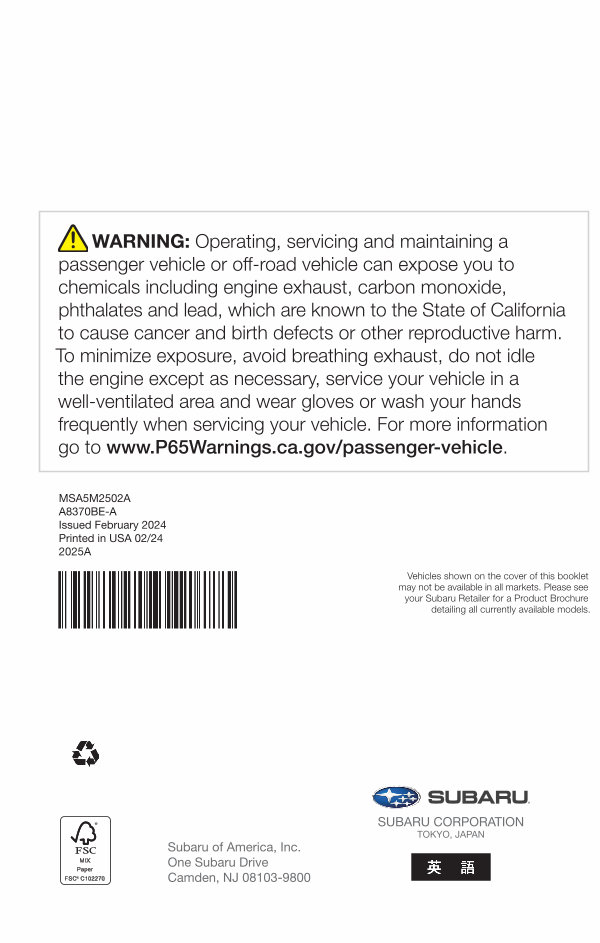 Vehicles shown on the cover of this booklet may not be available in all markets. Please see your Subaru Retailer for a Product Brochure detailing all currently available models.