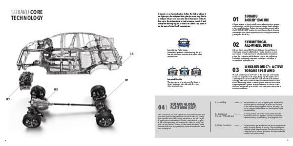 Subaru ' s core technologies define the Subaru brand and give you the unique driving feel you can only find in a Subaru. These core systems allow Subaru vehicles to live up to their standards in performance, comfort and safety while keeping its promise— to deliver enjoyment and peace of mind to all passengers.