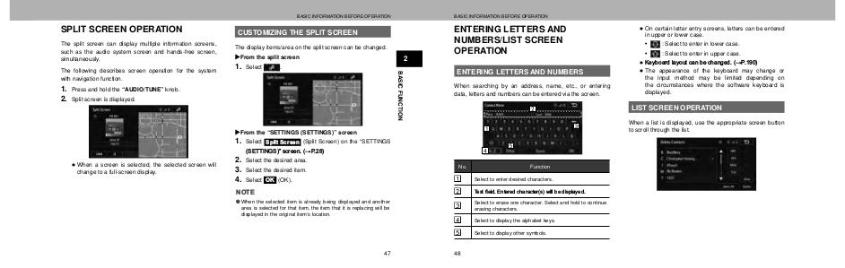 BASIC INFORMATION BEFORE OPERATION ENTERING LETTERS AND NUMBERS/LIST SCREEN OPERATION Ɣ On certain letter entry screens, letters can be entered in upper or lower case. ‡ : Select to enter in lower case. ‡ : Select to enter in upper case. Ɣ .H\ERDUGOD\RXWFDQEHFKDQJHG ĺ3 ENTERING LETTERS AND NUMBERS When searching by an address, name, etc., or entering data, letters and numbers can be entered via the screen. Ɣ The appearance of the keyboard may change or the input method may be limited depending on the circumstances where the software keyboard is displayed. LIST SCREEN OPERATION When a list is displayed, use the appropriate screen button to scroll through the list. No. Function Select to enter desired characters. 7H[W¿HOG(QWHUHGFKDUDFWHU V ZLOOEHGLVSOD\HG Select to erase one character. Select and hold to continue erasing characters. Select to display the alphabet keys. Select to display other symbols. 48