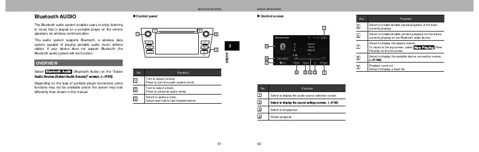 MEDIA OPERATION XControl screen No. Function Select to enable/disable repeat playback of the track currently playing. Select to enable/disable random playback for the tracks currently playing on the Bluetooth audio device. Select to display the playlist screen. To return to the top screen, select Now Playing (Now Playing) on the list screen. Select to display the portable device connection screen. ĺ3 Displays cover art. Select to display a track list. No. Function Select to display the audio source selection screen. 6HOHFWWRGLVSOD\WKHVRXQGVHWWLQJVVFUHHQ ĺ3 Select to play/pause. Shows progress. 92
